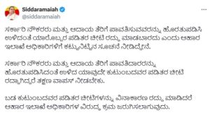 ಸರ್ಕಾರಿ ನೌಕರರು ಮತ್ತು ಆದಾಯ ತೆರಿಗೆ ಪಾವತಿದಾರರನ್ನು ಹೊರತುಪಡಿಸಿದಂತೆ ಉಳಿದ ಯಾವುದೇ ಕುಟುಂಬದವರ ಪಡಿತರ ಚೀಟಿ ರದ್ದಾಗಿದ್ದರೆ ತಕ್ಷಣ ವಾಪಸ್ ನೀಡಬೇಕು. ಬಡ ಕುಟುಂಬದವರ ಪಡಿತರ ಚೀಟಿಗಳನ್ನು ವಿನಾಕಾರಣ ರದ್ದು ಮಾಡಿದರೆ ಆಹಾರ ಇಲಾಖೆ ಅಧಿಕಾರಿಗಳ ವಿರುದ್ಧ ಕ್ರಮ ಜರುಗಿಸಲಾಗುವುದು. ಈ ಬಗ್ಗೆ ಸಿಎಂ ಸಿದ್ದರಾಮಯ್ಯ ಎಕ್ಸ್ ಖಾತೆನಲ್ಲಿ ವಾರ್ನ್ ಮಾಡಿದ್ದಾರೆ.